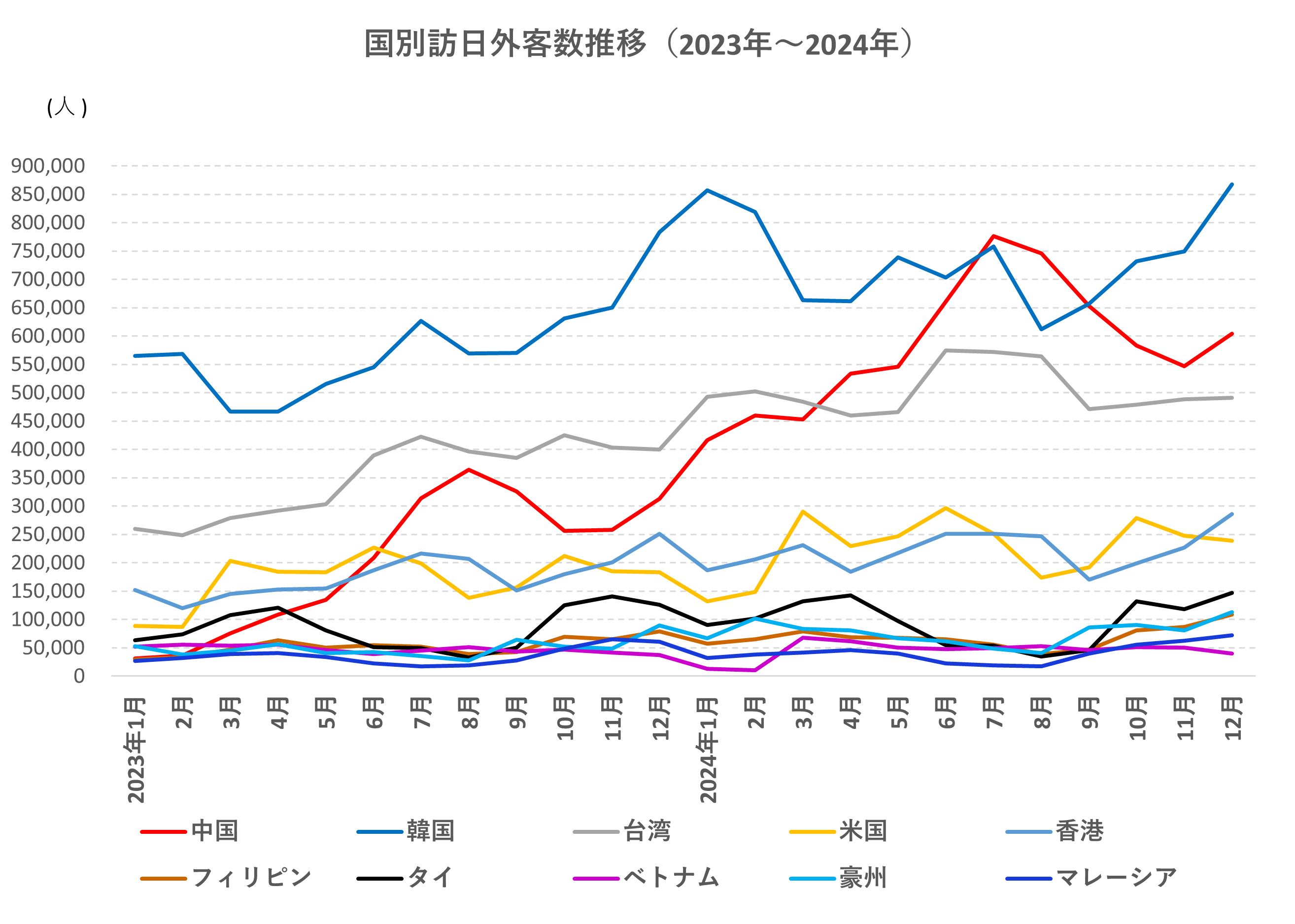 韓国からの訪日外客数が最も多く、2024年年末にかけて大きく増加しました。2024年12月は860,000人を超えています。