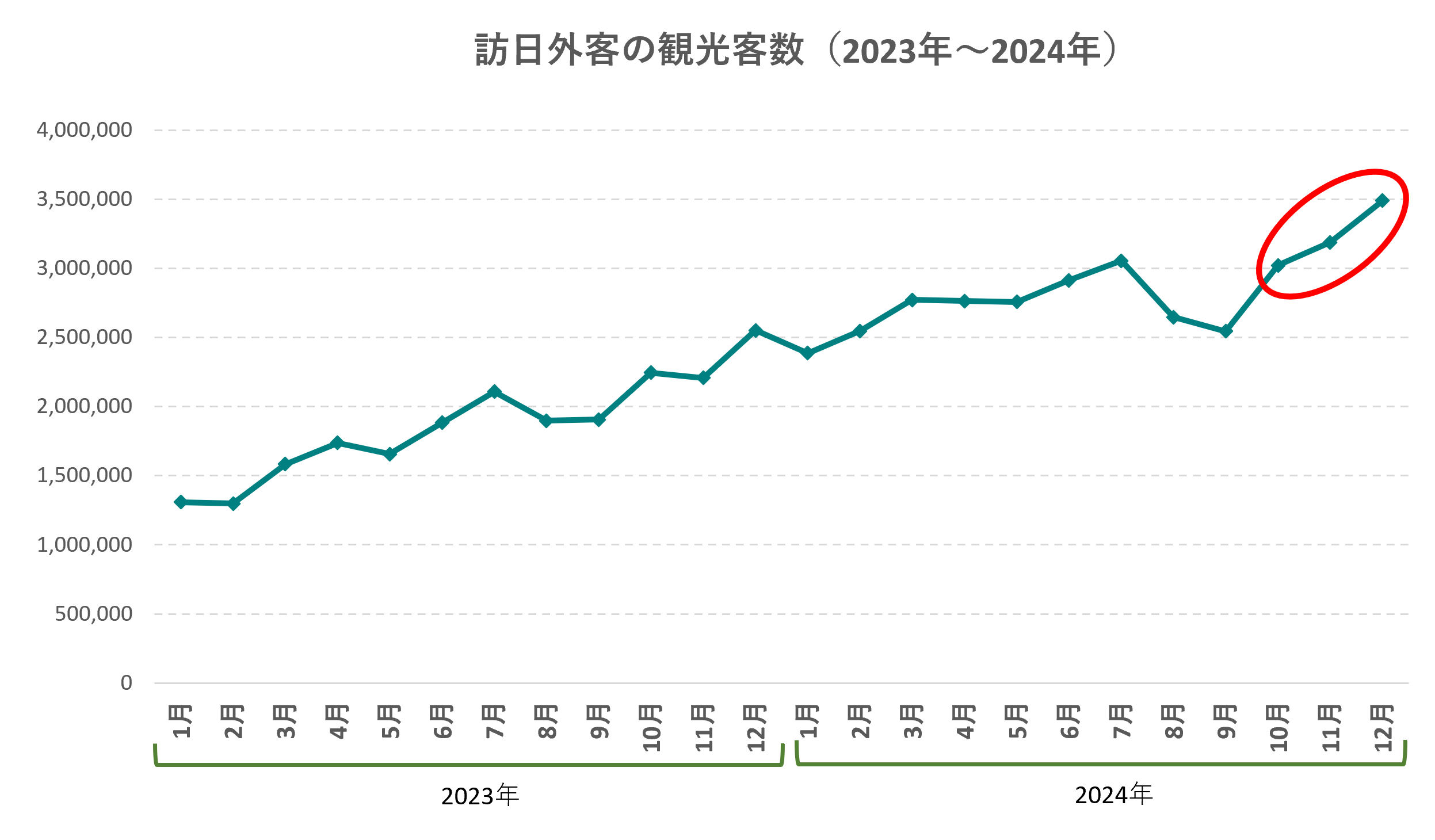 以下は、2023年1月から2024年12月までの訪日外客数をいこーよ総研がグラフにしたものです。