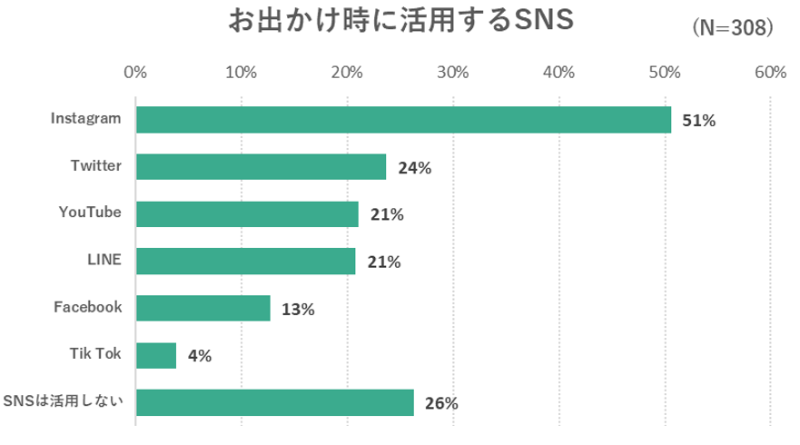また、お出かけ先を探す際に利用するSNSの中では、Instagramが最も多いことがわかりました。お出かけ先の写真情報へのニーズの高さが表れています。