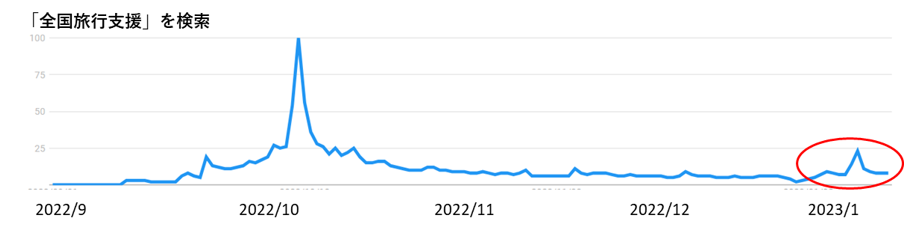「旅行」や「全国旅行支援」は、1月10日に再開された時期に多少の盛り上がりを見せていますが、秋に実施された時ほどではありません。1月の再開後では、秋に実施されたときと比べて割引率が下がったことなどが影響しているのではと推測しています。