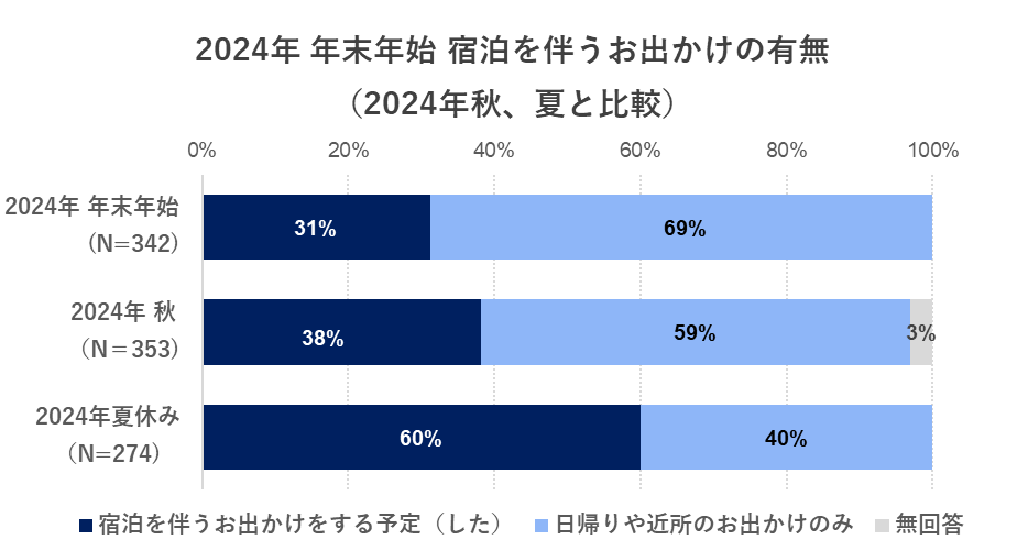 同じ長期休みでも年末年始は、夏休みと比べて期間も短く、家や実家などでゆっくりしたいという人も多いためか、宿泊を伴うお出かけの割合が低いと思われます。