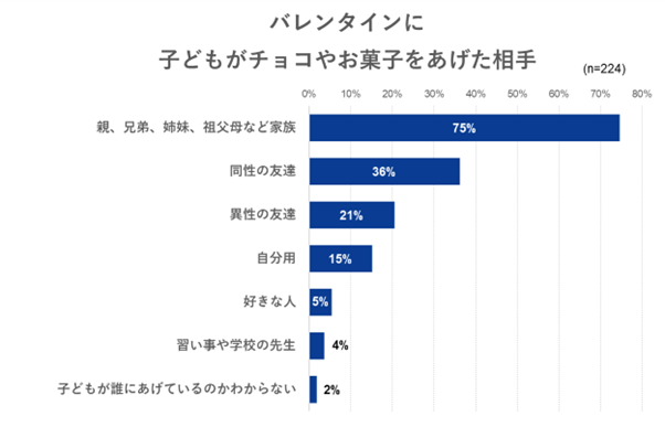 「親、兄弟、姉妹、祖父母など家族」が75%で、圧倒的多数でした。家族間でバレンタインを楽しむ家庭がとても多いことがわかります。