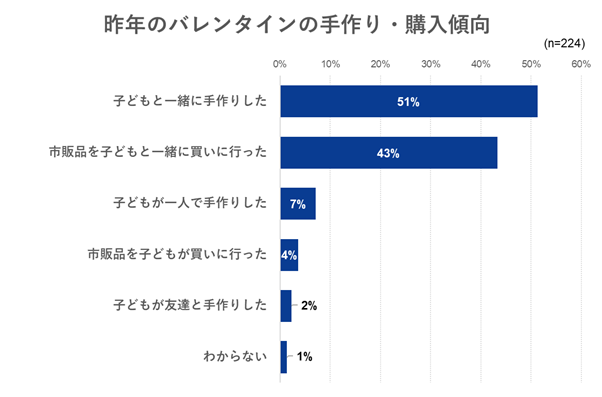 最も多かったのは「子どもと一緒に手作りした」が51%、次いで「市販品を子どもと一緒に買いに行った」が43%という結果でした。子どもと一緒に手作りするという家庭が多く、また市販品を買うときも「子どもと一緒に」という家庭が多数。家族で一緒に、バレンタインの準備を進めている様子が多く見られます。