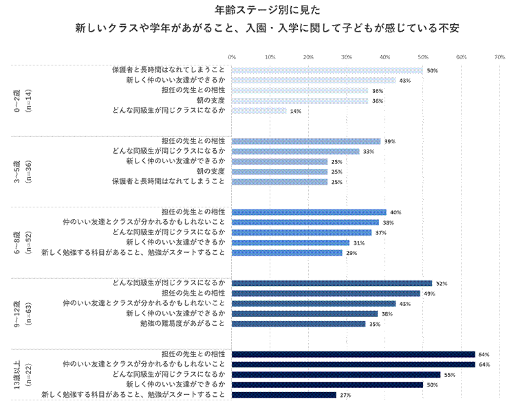 3〜5歳になると、「担任の先生との相性」(39%)が最も多く、次いで「どんな同級生が同じクラスになるか」(33%)、「新しく仲のいい友達ができるか」(25%)と、先生や友達など、周囲の人間関係に対する不安が中心になっていきます。
